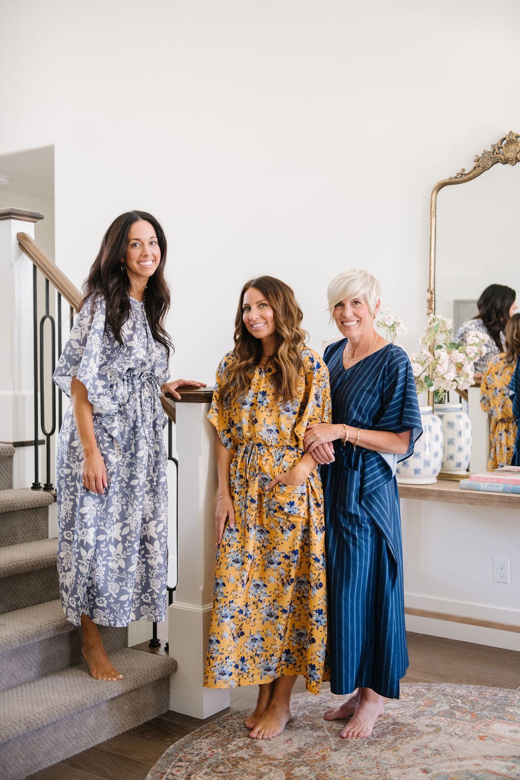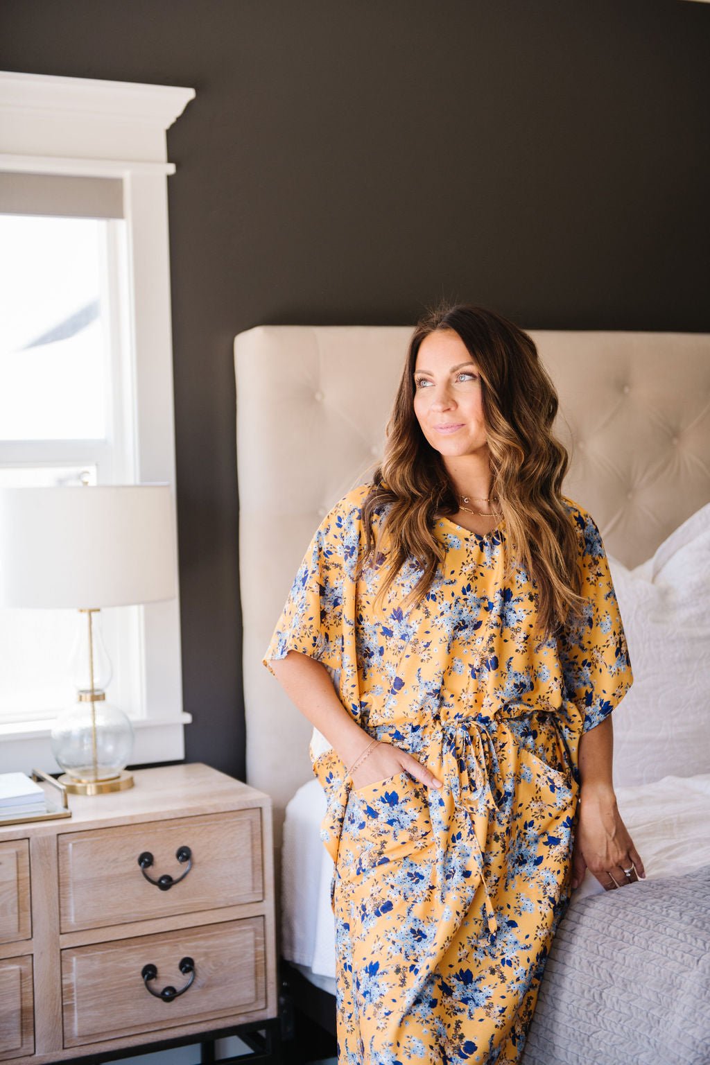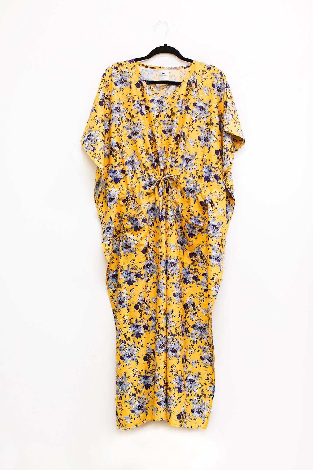 Yellow and blue floral. Our house dress, made of a lightweight, soft, synthetic silk, is effortless and easy. It's designed for full functionality with a drawstring waist to manage tightness, front pockets, and fabric that flows and hangs well on all body types. This dress fits comfortably sizes 0-16 and our extended size fits 14-3x. Easy care. Machine wash, tumble dry and remove promptly for best results.