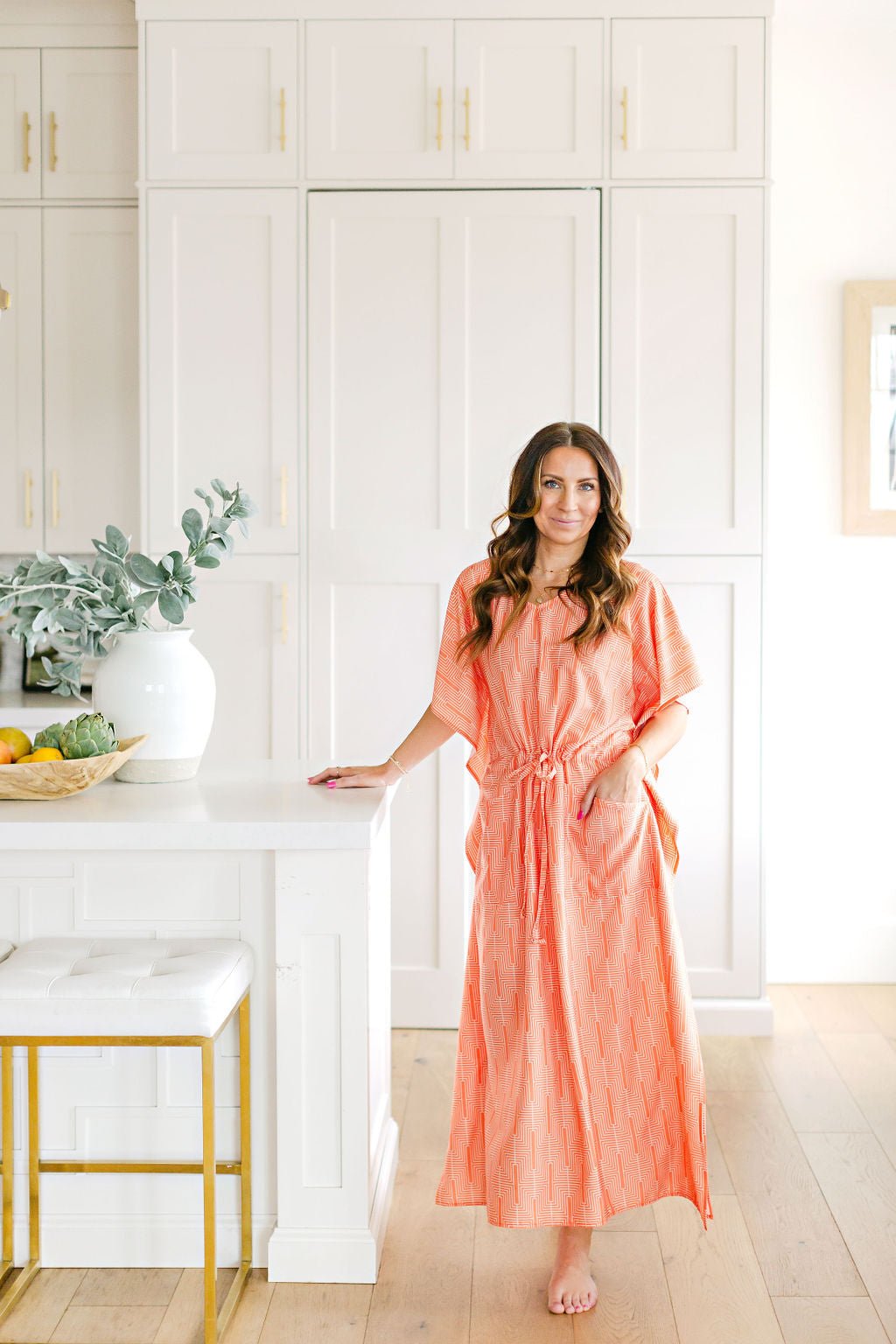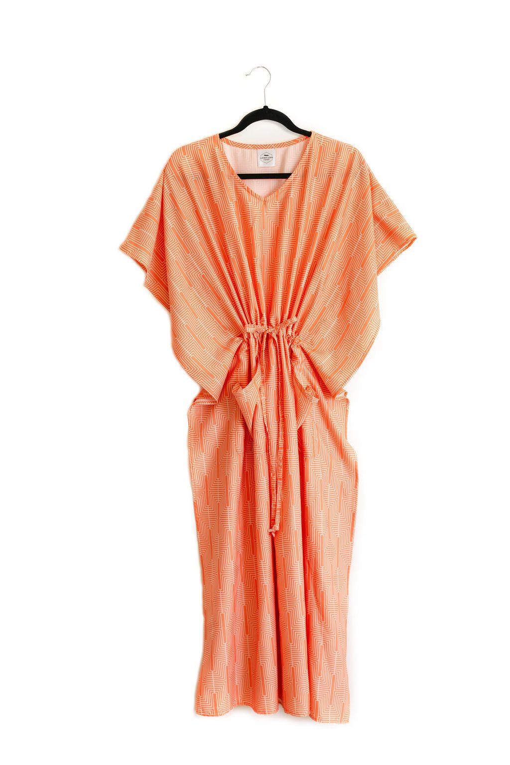 Perfect peach and cream geometric design. Our house dress, made of a lightweight, soft, synthetic silk, is effortless and easy. It's designed for full functionality with a drawstring waist to manage tightness, front pockets, and fabric that flows and hangs well on all body types. This dress fits comfortably sizes 0-16 and our extended size fits 14-3x. Easy care. Machine wash, tumble dry and remove promptly for best results.