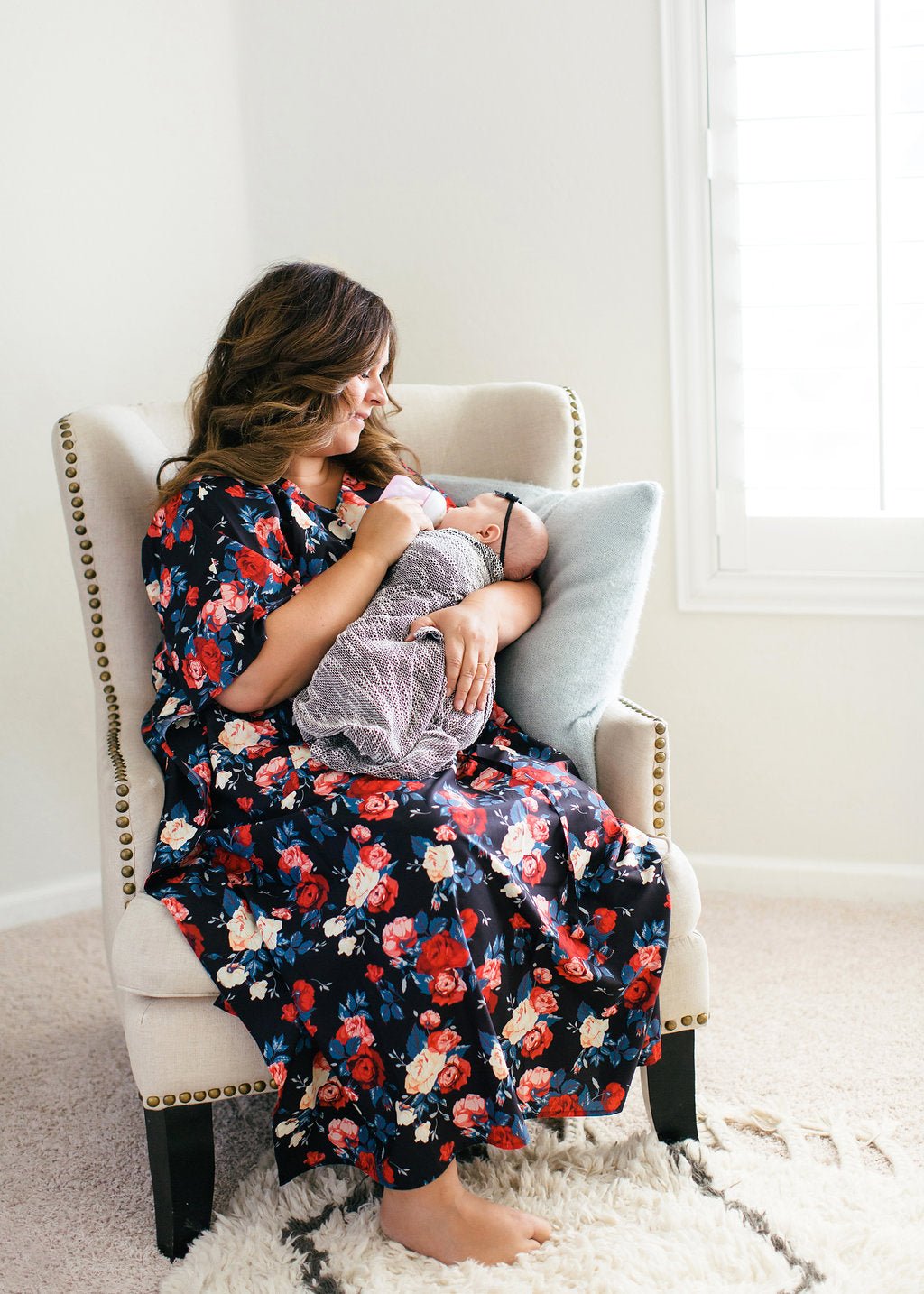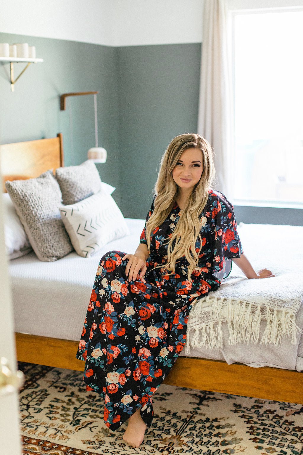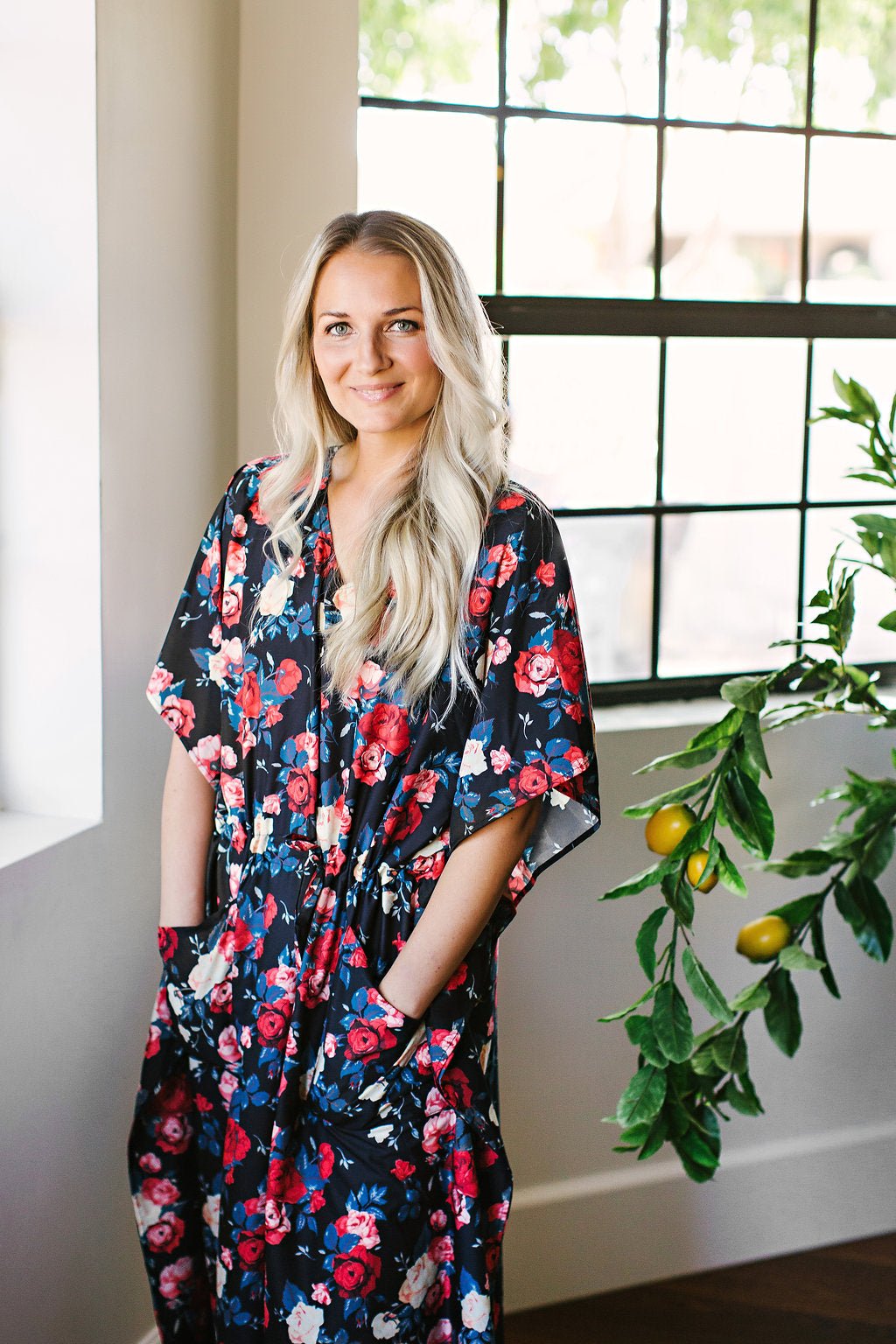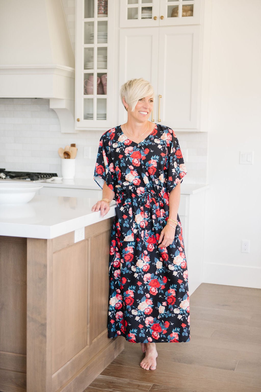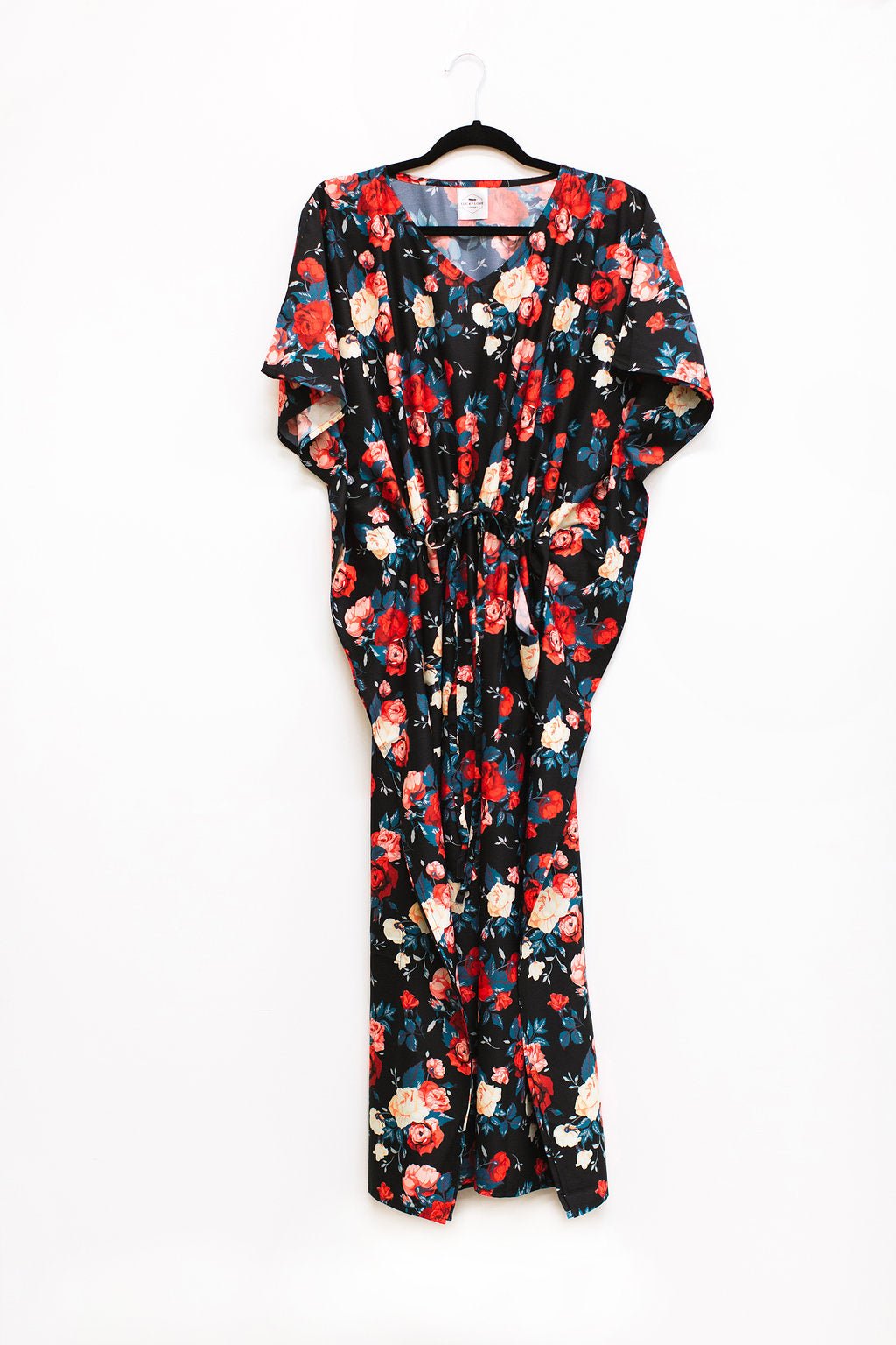 Black, red, teal, and peach floral. Our house dress, made of a lightweight, soft, synthetic silk, is effortless and easy. It's designed for full functionality with a drawstring waist to manage tightness, front pockets, and fabric that flows and hangs well on all body types. This dress fits comfortably sizes 0-16 and our extended size fits 14-3x. Easy care. Machine wash, tumble dry and remove promptly for best results.