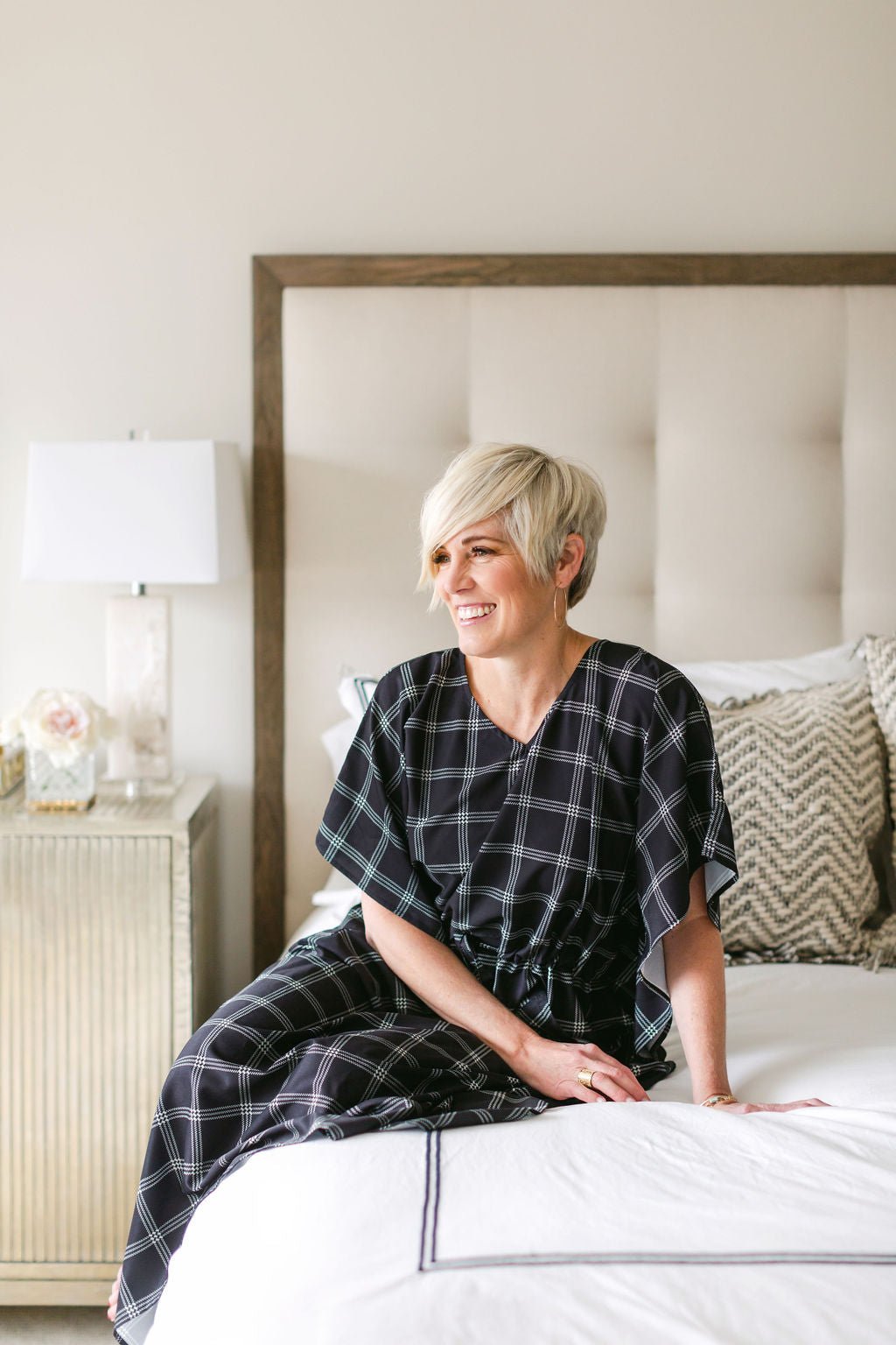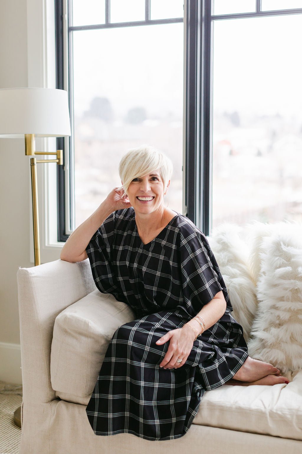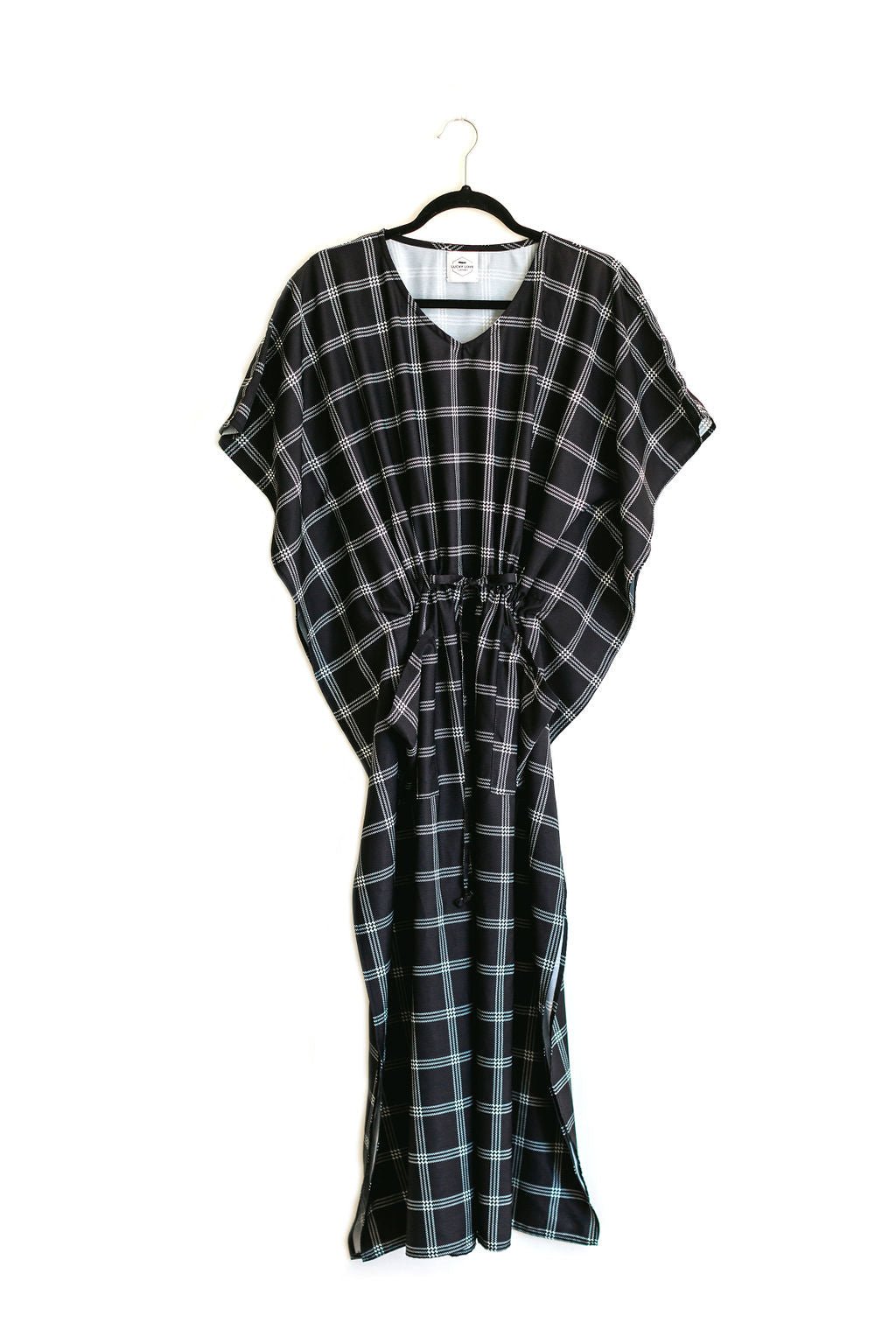Classic black and cream plaid design. Our house dress, made of a lightweight, soft, synthetic silk, is effortless and easy. It's designed for full functionality with a drawstring waist to manage tightness, front pockets, and fabric that flows and hangs well on all body types. This dress fits comfortably sizes 0-16 and our extended size fits 14-3x. Easy care. Machine wash, tumble dry and remove promptly for best results.