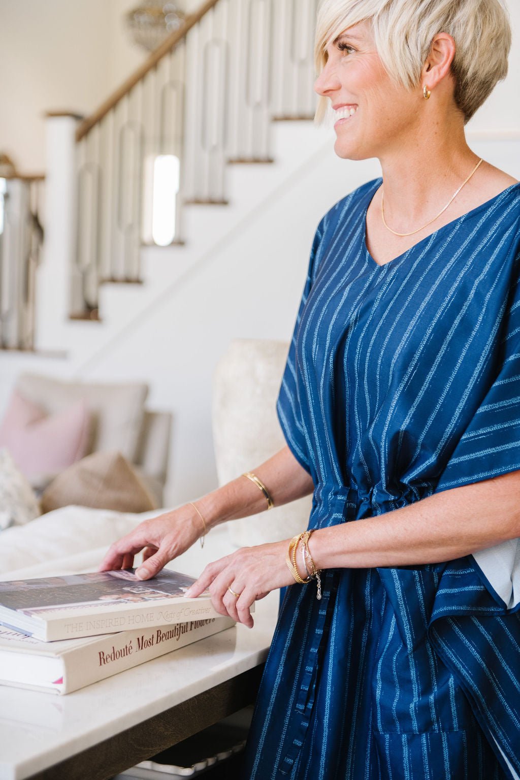 Blue and light blue stripe. Our house dress, made of a lightweight, soft, synthetic silk, is effortless and easy. It's designed for full functionality with a drawstring waist to manage tightness, front pockets, and fabric that flows and hangs well on all body types. This dress fits comfortably sizes 0-16 and our extended size fits 14-3x. Easy care. Machine wash, tumble dry and remove promptly for best results.
