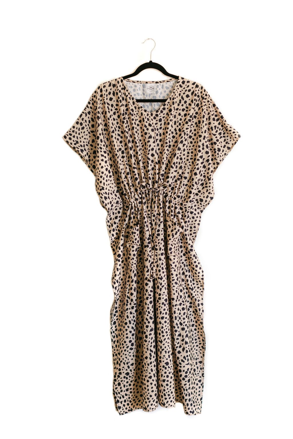 Classic cheetah design. Our house dress, made of a lightweight, soft, synthetic silk, is effortless and easy. It's designed for full functionality with a drawstring waist to manage tightness, front pockets, and fabric that flows and hangs well on all body types. This dress fits comfortably sizes 0-16 and our extended size fits 14-3x. Easy care. Machine wash, tumble dry and remove promptly for best results.