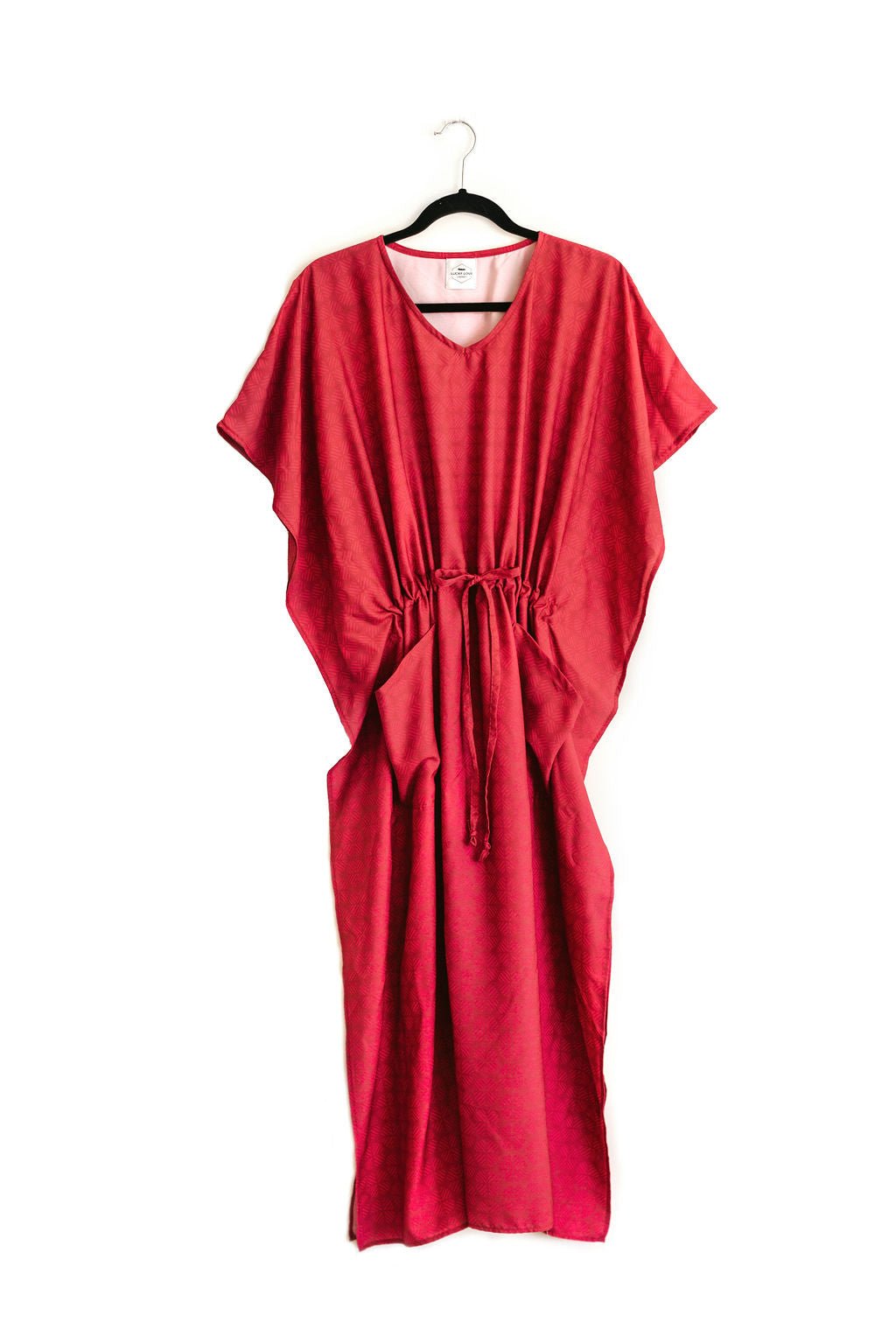 Red on red circle design. Our house dress, made of a lightweight, soft, synthetic silk, is effortless and easy. It's designed for full functionality with a drawstring waist to manage tightness, front pockets, and fabric that flows and hangs well on all body types. This dress fits comfortably sizes 0-16 and our extended size fits 14-3x. Easy care. Machine wash, tumble dry and remove promptly for best results.
