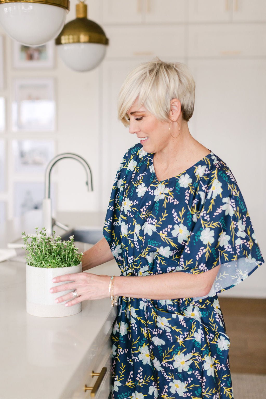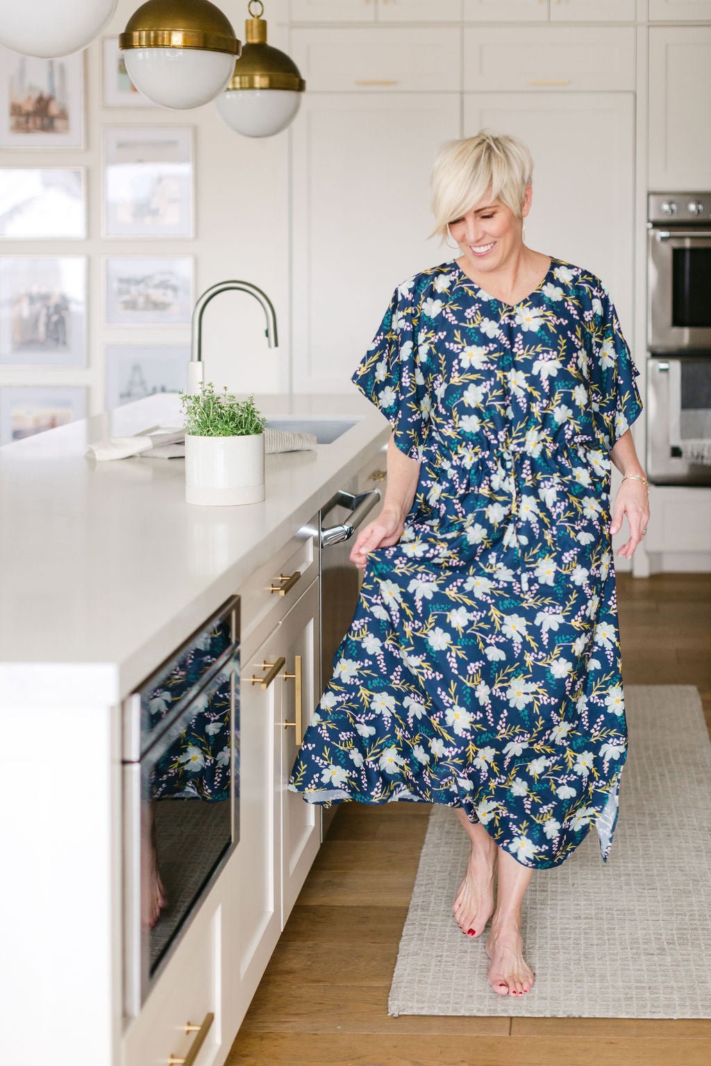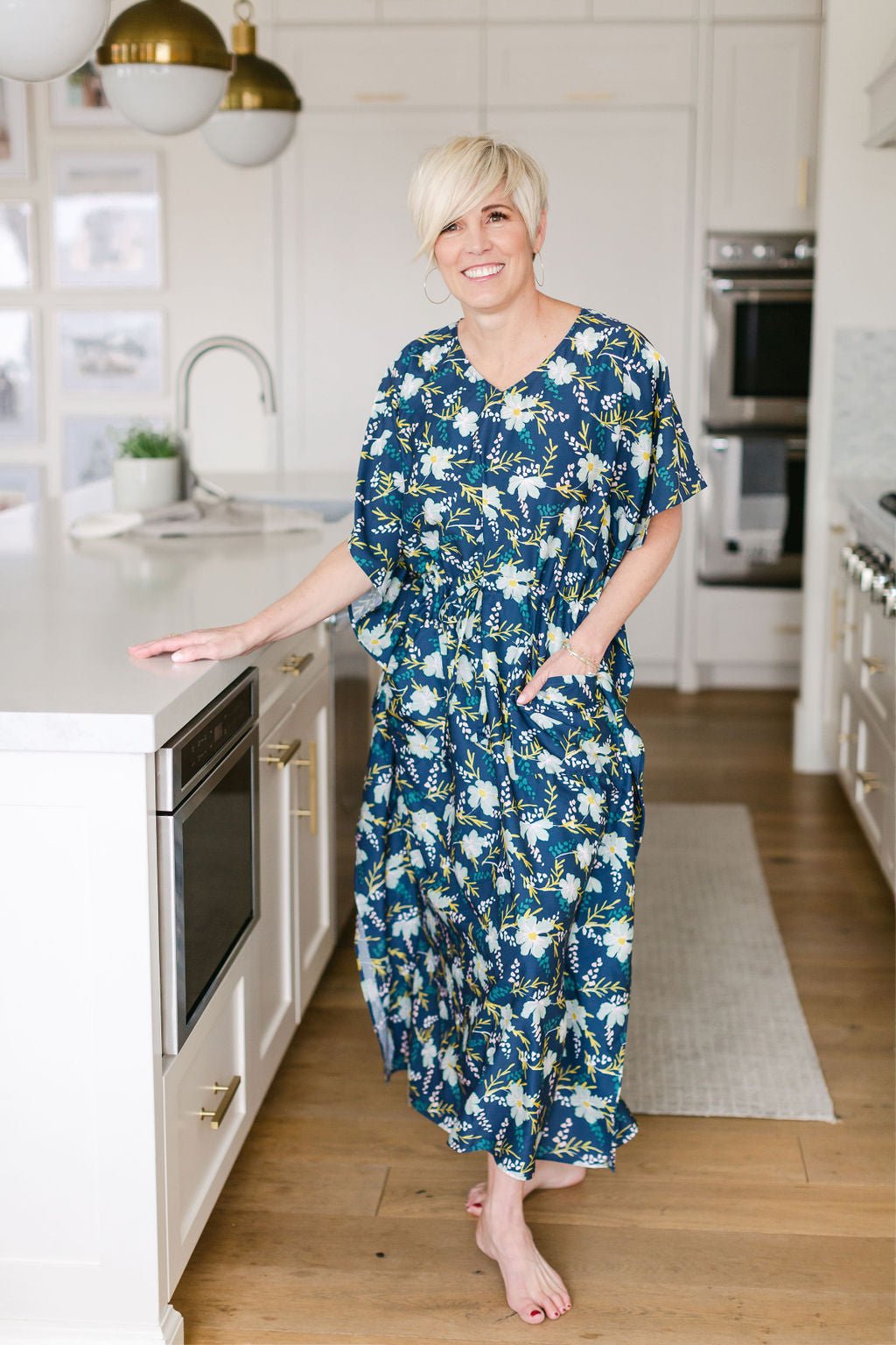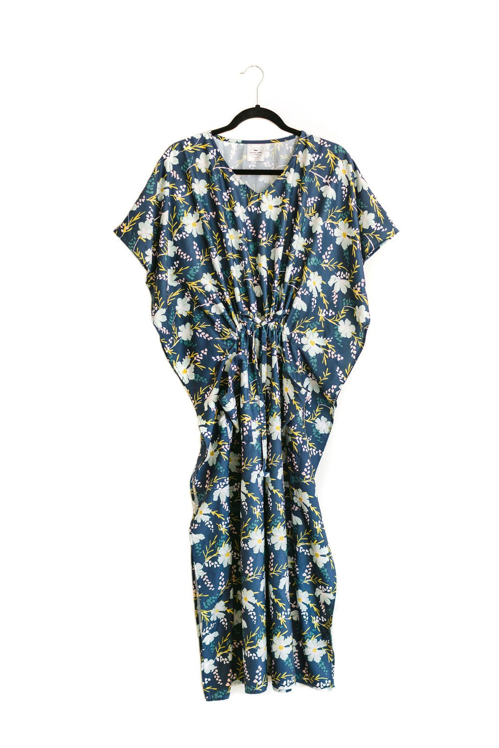 Beautiful floral pattern on navy. Our house dress, made of a lightweight, soft, synthetic silk, is effortless and easy. It's designed for full functionality with a drawstring waist to manage tightness, front pockets, and fabric that flows and hangs well on all body types. This dress fits comfortably sizes 0-16 and our extended size fits 14-3x. Easy care. Machine wash, tumble dry and remove promptly for best results.